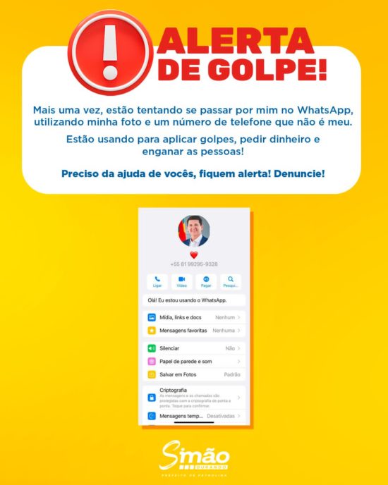O gestor ainda destacou que o alerta vale para todos os cidadãos que forem surpreendidos com pedido dessa natureza, via WhatsApp. “Mais uma vez estão tentando aplicar esse golpe. Reforço que eu não mudei de número e quem receber alguma mensagem desse tipo denuncie o contato porque é golpe. Não façam nenhuma transferência em dinheiro, sempre desconfie de situações como essa, liguem, façam chamada de vídeo, infelizmente esse golpe tem se tornado muito corriqueiro“, destacou o prefeito Simão Durando.