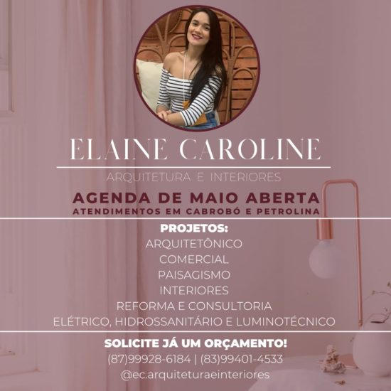 Elaine Caroline está com a agenda aberta, atendendo em Cabrobó e região. Disponibilidade para projetos arquitetônicos, comerciais, interiores, reformas e consultorias.