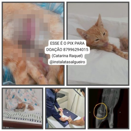 Uma gatinha (filhote) que atende por Mavie, de apenas 2 meses de vida foi mordida por um cão adulto. Ela está com infecção e o osso da perna esquerda foi fraturado. Ela vai precisar passar por uma cirurgia porém o custo é alto, por isso estamos pedindo doações.