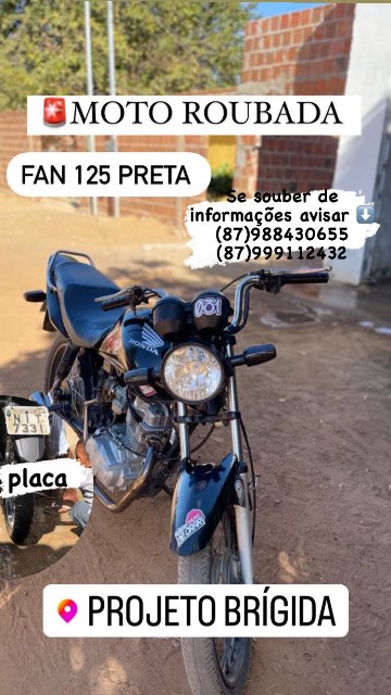 Leitor pede ajuda dos internautas para recuperar sua moto que foi roubada no sábado (3), a moto FAN 125 de cor preta, Placa – NIT – 7331. O mesmo deixou a moto estacionada e entrou num estabelecimento comercial na agrovila -4, pouco tempo depois o mesmo saiu e sua moto já não estava mais no local.