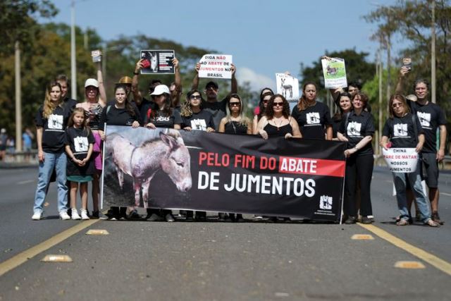 A manifestação apontou que os jumentos correm o risco de extinção devido à crescente demanda comercial do ejiao, um produto extraído do colágeno da pele do animal e utilizado como medicamento na China.