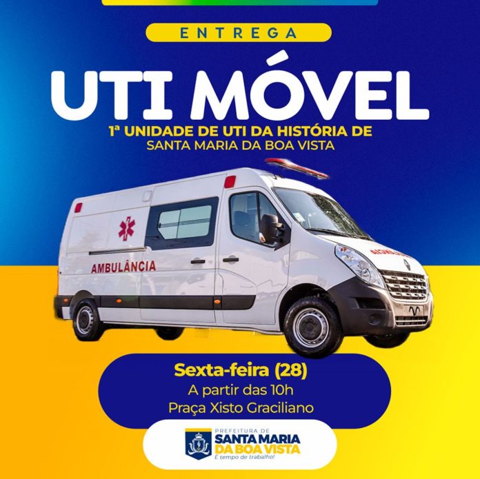 Nesta sexta-feira (28), o prefeito de Santa Maria da Boa Vista, George Duarte, irá entregar a primeira UTI da história do município. Trata-se de uma UTI Móvel, fruto de parceria do gestor boavistano com o deputado estadual Antônio Coelho. O ato solene acontecerá a partir das 10h, na Praça Xisto Graciliano, e deverá contar com a presença de autoridades, líderes comunitários e a população em geral.