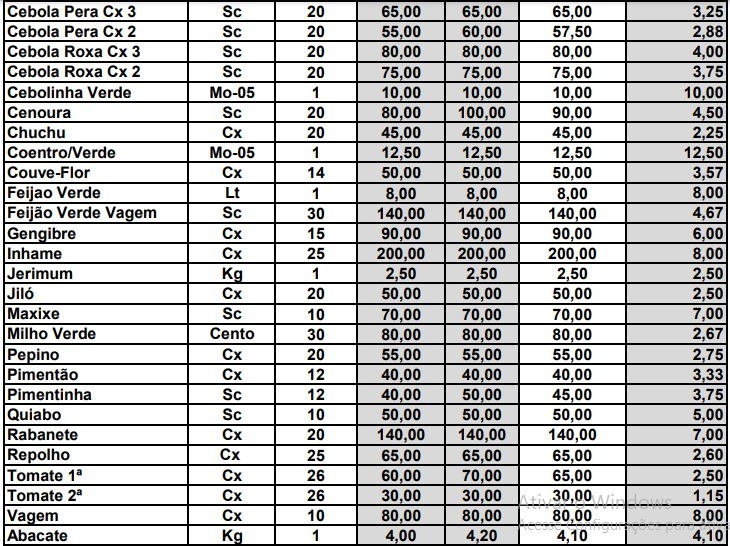 O consumidor que for à Ceasa ao longo do dia pode encontrar Feijão Verde por R$ 8,00 o litro; Inhame por R$ 200,00 a caixa com 25 kg; Pimentão por R$ 40,00 a caixa com 12 kg; Tomate 1ª por R$ 65,00 a caixa com 26 kg; Abacaxi por R$ 365,00 o cento; Acerola por R$ 60,00 a caixa com 20 kg; Banana Pacovan 1ª por R$ 40,00 o cento e Coco Verde por R$ 110,00 o cento; já a cebola varia de R$ 55 a R$ 80 o saco com 20 Kg.