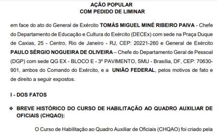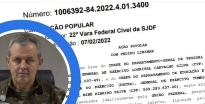 Na denuncia que encabeça a Ação Civil Pública 1006392-84.2022.4.01.3400, o general Tomás Miné, apontado como escolhido por Lula para ser o novo comandante do Exército, é acusado de RESPONSABILIDADE por irregularidades na condução de processos seletivos para cursos que geram promoções e / ou adicionais nas remunerações de militares do Exército Brasileiro.