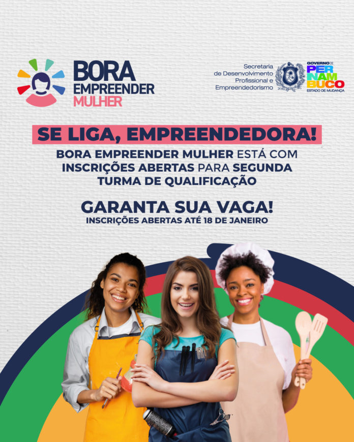 A modalidade do programa Bora Empreender específica para a população feminina, Bora Empreender Mulher, está com inscrições em andamento para a segunda turma de qualificação. A iniciativa foi lançada pelo Governo do Estado, através da Secretaria de Desenvolvimento Profissional e Empreendedorismo de Pernambuco (SEDEPE) e da Secretaria da Mulher, em novembro do ano passado, contando com ampla adesão do público. Para participação na etapa atual, as interessadas devem se inscrever até a próxima quinta-feira (18).