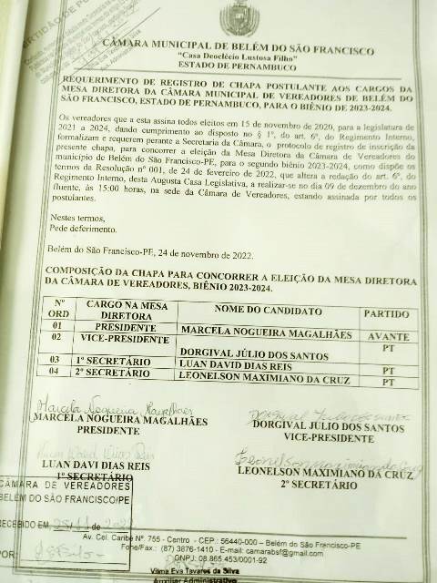 Os vereadores de Belém do São Francisco escolherão no próximo dia (09/12) os membros da Mesa Diretora para o Biênio 2023-2024. Conforme prevê o regimento interno da casa, o registro de candidatura de chapa deve ser feito, dez dias antes da eleição, e apenas uma chapa foi formada e registrada.
