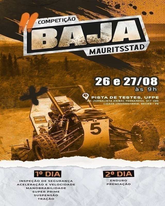 A Universidade Federal de Pernambuco (UFPE) sedia, neste fim de semana, a segunda edição da Baja Mauritsstad. A competição ocorre nos dias 26 e 27, a partir das 9h, na Pista de Testes da UFPE, localizada ao lado do Centro de Informática (CIn). O evento terá a participação de 12 equipes de faculdades do Nordeste. A entrada é gratuita e aberta ao público.