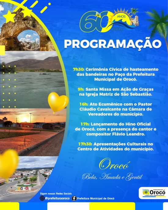A Prefeitura Municipal de Orocó, tem a honra de convidá-los para as comemorações em homenagem aos 60 anos da nossa cidade, no próximo dia 20 de Dezembro de 2023.