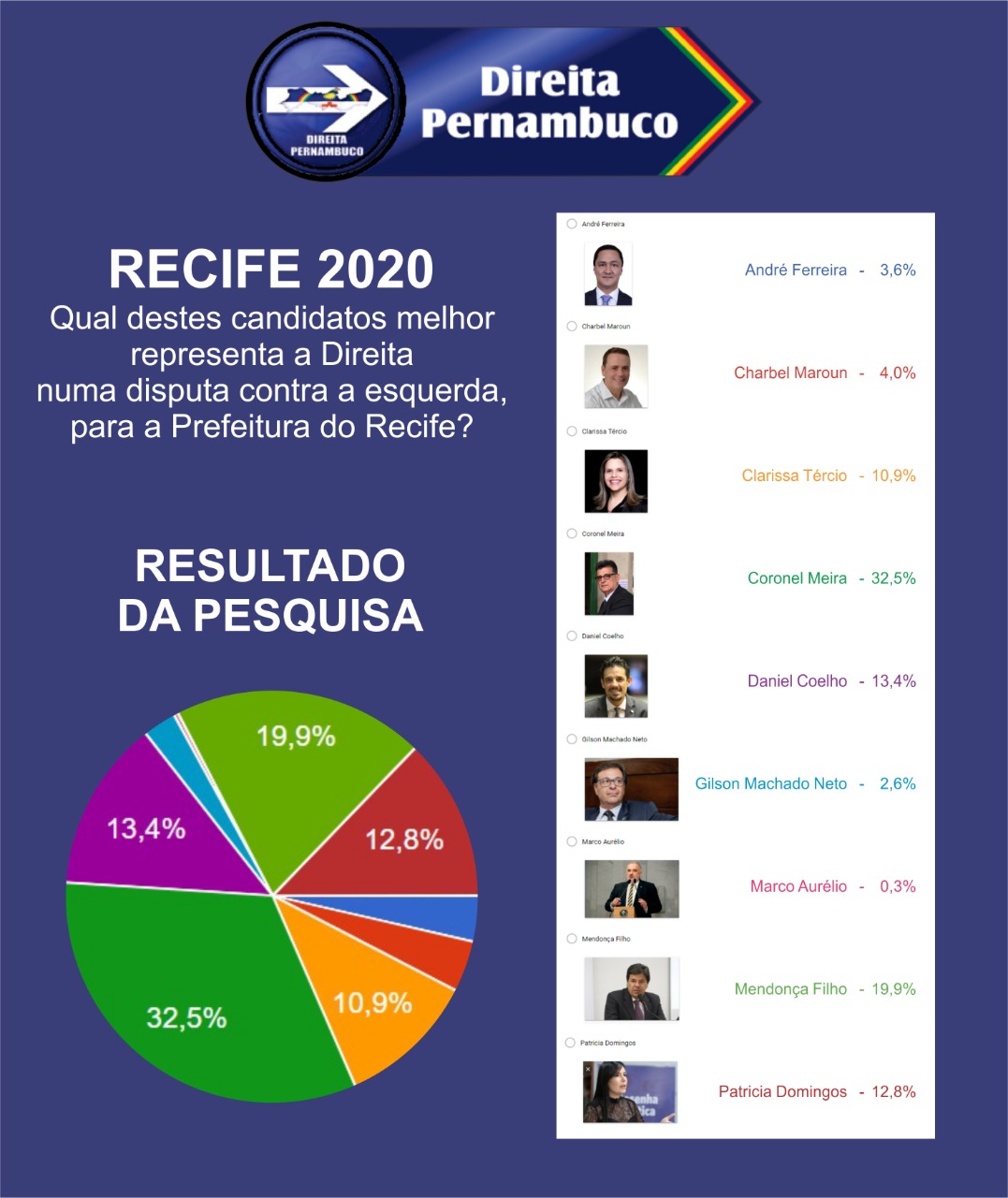 A consulta apresentou nomes de políticos tradicionais como André Ferreira, Daniel Coelho, Marco Aurélio e Mendonça Filho, além de novas lideranças como a delegada Patrícia Domingos, o Presidente da Embratur, Gilson Machado Neto e o procurador Charbel Maroun, porém, quem ganhou a preferência dos Grupos de Direita foi o Coronel Meira que atingiu 1/3 dos votos, superando o ex-governador Mendonça Filho, em 12,6% – que foi o segundo mais votado: ao todo foram questionadas 947 pessoas.