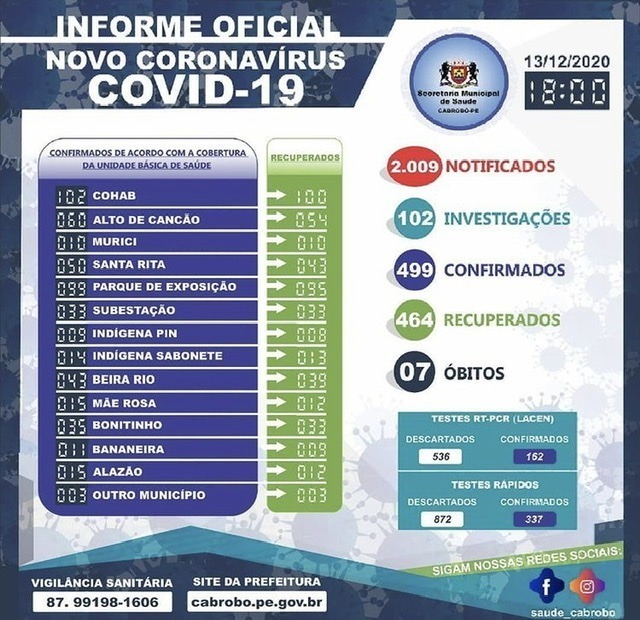 Covid-19: Cabrobó registra 1 novo caso confirmado neste domingo (13/12) Por Didi Galvão - 13 de dezembro de 2020 0