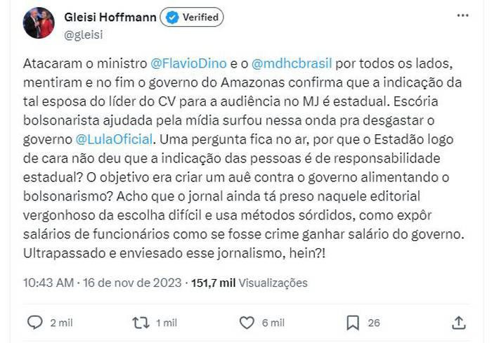 O que disse o PT? – A distorção foi divulgada pela presidente nacional do PT, a deputada federal Gleisi Hoffmann (PT-PR), em um post no X (antigo Twitter) nesta quinta-feira (16). “Atacaram o ministro Flávio Dino e o Ministério dos Direitos Humanos por todos os lados, mentiram e no fim o governo do Amazonas confirma que a indicação da tal esposa do líder do CV para a audiência no MJ é estadual (…)”.