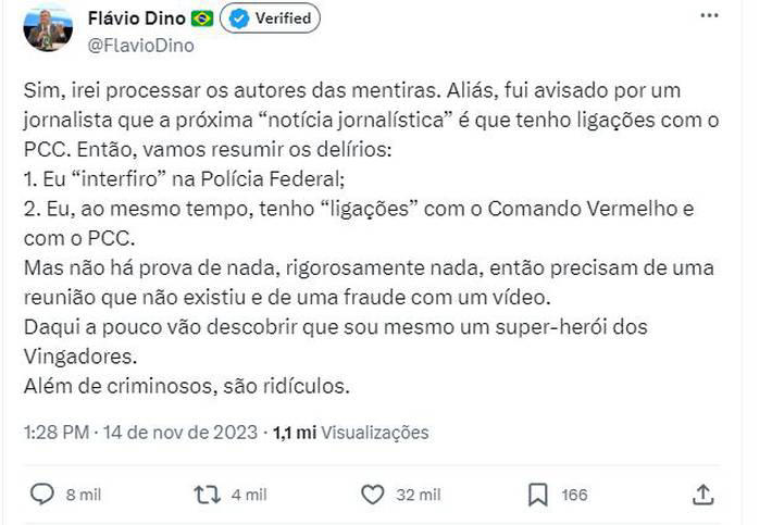 O que disse o ministro – Na terça-feira (14), depois da divulgação das primeiras reportagens sobre o caso, o ministro Flávio Dino disse em postagem no X (antigo Twitter) que foi “avisado por um jornalista que a próxima ‘notícia jornalística’ é que tenho ligações com o PCC”, referindo-se ao Primeiro Comando da Capital, a principal facção criminosa brasileira, de origem paulista. “Eu, ao mesmo tempo, tenho ‘ligações’ com o Comando Vermelho e com o PCC”, escreveu ele.