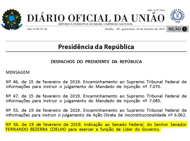 Brasília, 20/02/19 – Está publicada na edição de hoje (20) do Diário Oficial da União (primeira página da Seção 1) a nomeação de Fernando Bezerra Coelho (MDB-PE) para exercer a função de líder do governo no Senado. A escolha do senador para o cargo foi confirmada pelo presidente Jair Bolsonaro nesta terça-feira (19).
