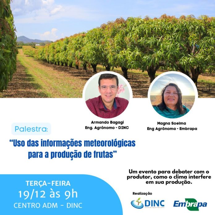 Para Armando Bagagi, esse tema é importante e pode fazer a diferença na rotina de produção. “Queremos promover um debate técnico sobre a agricultura irrigada, em especial a agrometeorologia, voltada ao processo de produção de frutas. É um assunto que muitos usuários do DINC ainda não sabem, então o nosso intuito é ajudá-los. Quero convidar a todos os produtores do DINC, setor Nilo Coelho e área Maria Tereza a participarem desse debate”, pontuou.