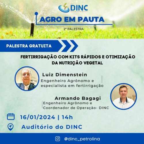 O Distrito de Irrigação Nilo Coelho (DINC) tem a satisfação de anunciar a data da 2ª palestra, agendada para o dia 16 de janeiro às 14h. O evento acontecerá no auditório da Sede Administrativa, localizada na Vila C1 do Projeto Irrigado Senador Nilo Coelho.