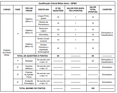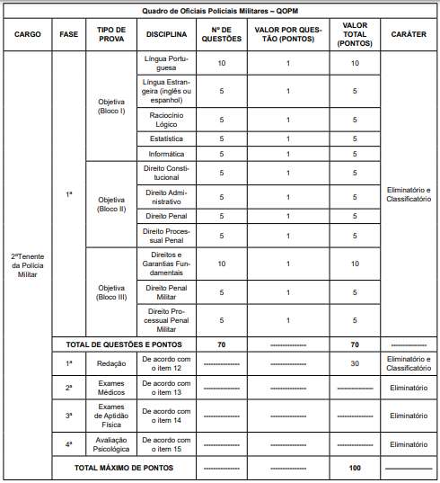 As provas objetivas serão compostas por 60 questões para Soldado e 70 questões para Oficial, todas de peso 1. Serão 5 alternativas em cada questão e apenas uma resposta correta.