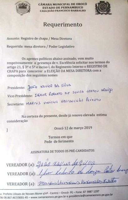 Eleição da mesa diretora da Câmara de Orocó terá apenas uma única chapa