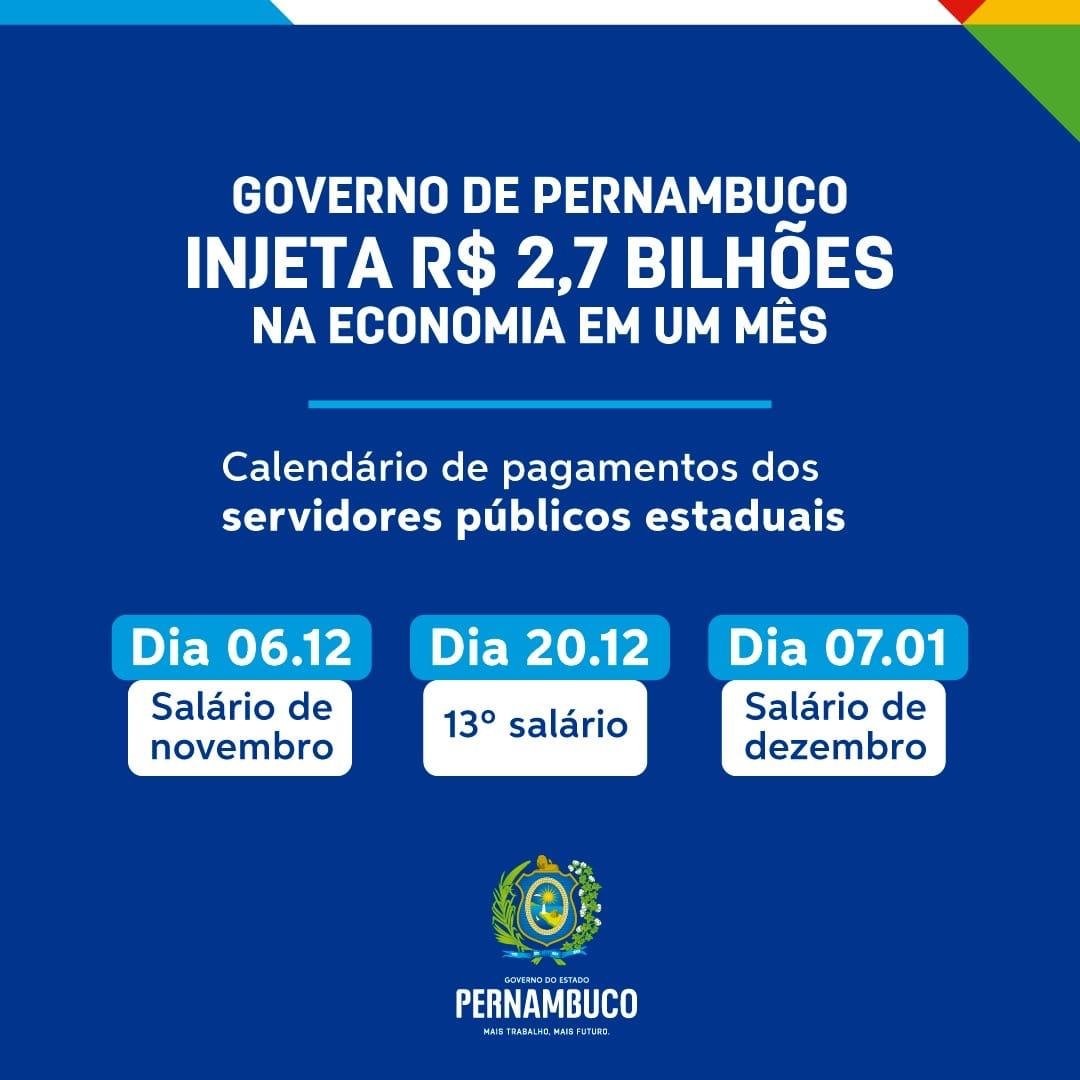 O governador Paulo Câmara anunciou, nesta segunda-feira (25.11), uma injeção de aproximadamente R$ 2,7 bilhões na economia pernambucana, no período de apenas um mês. Esse é o montante que o Governo do Estado vai aplicar no pagamento dos vencimentos de novembro e dezembro do funcionalismo estadual, além do 13º salário, que será pago no próximo dia 20 de dezembro. De acordo com o calendário divulgado nesta segunda, as folhas de pagamento dos meses de novembro e dezembro serão pagas nos dias 06 de dezembro e 07 de janeiro, respectivamente. A medida trará mais robustez para o comércio local e para outros setores da economia do Estado.