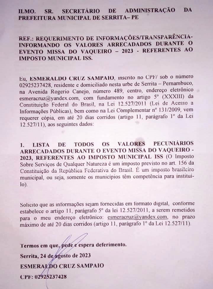 Membro do Partido Comunista do Brasil, Esmeraldo Cruz, pediu informações ao poder público de Serrita, referente a arrecadação em dinheiro gerada através do imposto municipal ISS – Imposto Sobre Serviços.