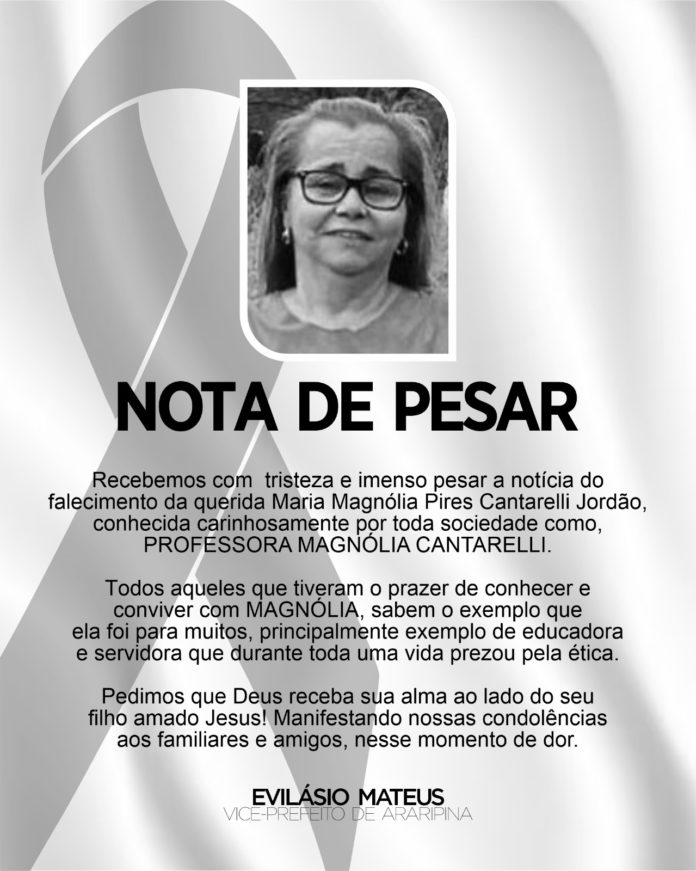 Recebemos com tristeza e imenso pesar a notícia do falecimento da querida Maria Magnólia Pires Cantarelli Jordão, conhecida carinhosamente por toda sociedade como, PROFESSORA MAGNÓLIA CANTARELLI.
