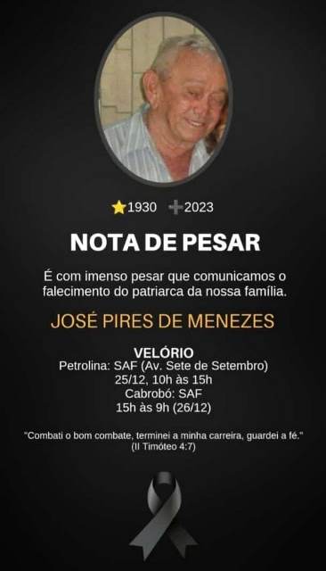 Sepultamento: O sepultamento de José Pires de Menezes, conhecido por Zé do Mucambo, será as 9h da manhã desta terça-feira (26). A família agradece a todos pelas manifestações de carinho e solidariedade, ao tempo que os convidam para se fazer presente na programação fúnebre.
