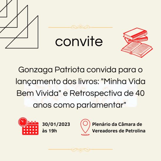 Dentre tantas coisas boas que eu já fiz na vida, como uma dúzia de filhos, 14 netos, bisnetos, 47 livros escritos, sendo 45 publicados. Esse livro que lanço hoje em Petrolina, ‘Minha Vida Bem Vivida’ é um livro que mostra que pra gente viver bem, não precisa ser de família rica. Gonzaga Patriota nasceu nas caatingas, de família humilde com 21 irmãos, mas durante minha vida, que foi bem vivida, pois Deus me ajudou, a sociedade também, e principalmente nesses 40 anos como parlamentar, fiz tudo que podia fazer pra ajudar o povo.” – disse Gonzaga Patriota.