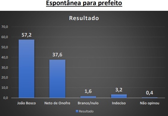 Na pesquisa espontânea João Bosco aparece com 57,2% das intenções de voto contra 37,6% de Neto de Onofre. Brancos e nulos são 1,6%; Indecisos somam 3,2% e 0,4 não opinaram.