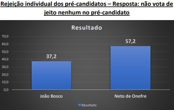 No quesito rejeição, Neto de Onofre aparece com 57,2% e João Bosco com 37,2%.