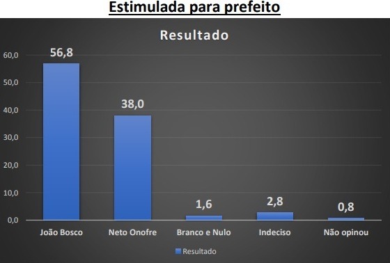 Na pesquisa estimulada, João Bosco atinge 56,8% dos entrevistados, enquanto que Neto de Onofre aparece com 38%. Brancos e nulos são 1,6%; Indecisos somam 2,8% e 0,8 não opinaram.