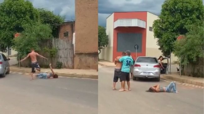 Homem agride mulher com chutes no meio da rua