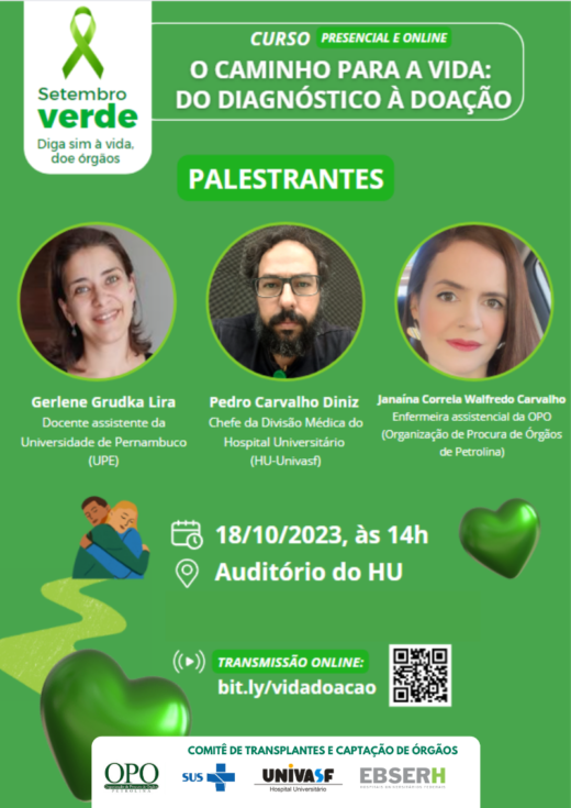 Em alusão ao recém-celebrado Setembro Verde, campanha dedicada à conscientização sobre doação de órgãos, será realizado, na próxima quarta-feira, 18, no Hospital Universitário da Univasf (HU-Univasf/Ebserh), o curso ‘O caminho para a vida: do diagnóstico à doação’, organizado pelo Comitê de Transplantes e Captação de Órgãos do HU, em conjunto com a Organização de Procura de Órgãos (OPO) de Petrolina.