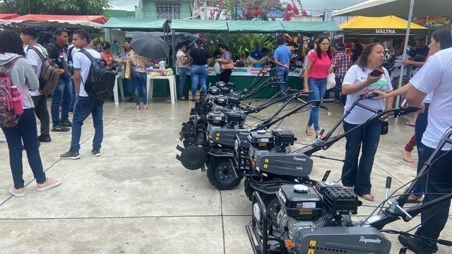 Estandes de empresas com máquinas e equipamentos agrícolas, exposição e vendas de produtos da agricultura regional.