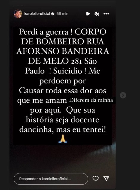 Instantes antes, ele havia relatado que não estava conseguindo contato com Karol. A influenciadora havia postado uma mensagem de despedida, indicando que iria tirar a própria vida.