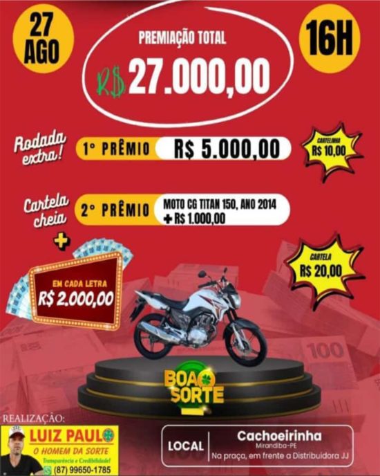 Se liga galerinha! No domingo dia 27 de agosto, você tem um encontro marcado às 16h na Cachoeirinha em Mirandiba na praça em frente a Distribuidora JJ. Será realizado o Bingão com R$ 27.000 vinte e sete mil reais em prêmios!