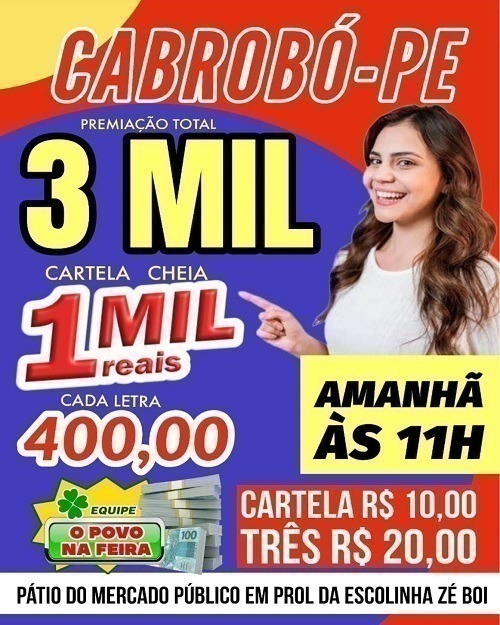 Neste sábado (25), O Povo na Feira tem mais uma premiação para você, às 11h no Pátio do Mercado Público de Cabrobó, bingo beneficente em prol da Escolinha de Zé Boi.