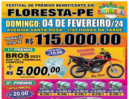Próximo domingo, 4 de fevereiro, às 15h (3 da tarde) na Avenida Santa Rosa em Floresta, será realizado o Festival de Prêmios Beneficente com R$ 115.000 (cento e quinze mil reais) em prêmios!
