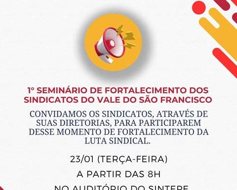 Acontece nesta terça-feira (23), no auditório do Sindicato dos Trabalhadores da Educação de Pernambuco (SINTEPE), o 1º. Seminário de Fortalecimento dos Sindicatos do Vale do São Francisco. O evento começa às 8h da manhã e seguirá durante todo o dia, até às 18h, com uma programação importante para trabalhadores e trabalhadoras da educação, servidores públicos municipais, trabalhadores rurais assalariados...