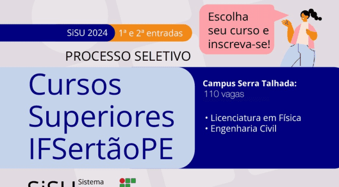 Na última sexta-feira (19), o Instituto Federal do Sertão Pernambucano (IFSertãoPE) divulgou o edital n.º 01/2024, destinado ao preenchimento de vagas nos cursos superiores oferecidos pela Instituição para o ano de 2024. Ao todo, estarão disponíveis 969 vagas por meio do Sistema de Seleção Unificada (Sisu), distribuídas entre os sete campi da Instituição. Em Serra Talhada, estão sendo oferecidas vagas nos...