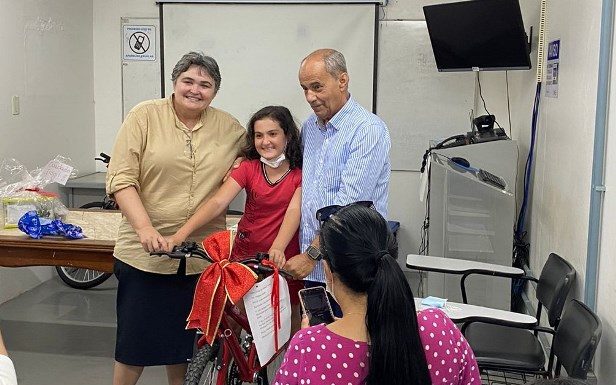 Geovanna, de 7 anos, era só sorrisos enquanto recebia das mãos da Superintende do Instituto Social Medianeiras da Paz (Ismep), Irmã Fátima Alencar, e do Presidente da Federação dos Hospitais filantrópicos de Pernambuco (FEHOSPE), Gil Brasileiro, a bicicleta dos sonhos. Geovanna é uma das 30 crianças que fazem tratamento contra o câncer no Hospital Dom Malan em Petrolina, no...