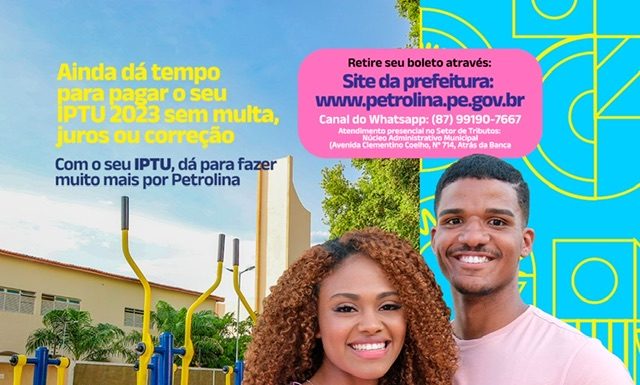 A Prefeitura de Petrolina, através da Secretaria da Fazenda e Planejamento, informa aos contribuintes com o IPTU 2023 em atraso, que é possível pagar o tributo sem multas e juros até esta quarta-feira (27). Essa iniciativa permite que os contribuintes possam pagar o IPTU 2023 no seu valor original.