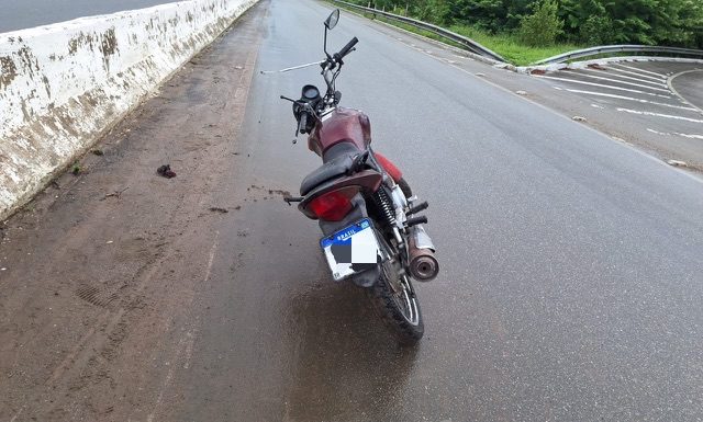 O condutor de uma motocicleta perdeu o controle do veículo, colidiu na mureta da rodovia e em um poste. O homem estava sozinho no veículo e faleceu no local.