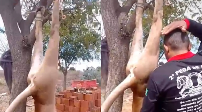 No vídeo, o animal era exibido pelos criminosos mostrando a onça morta, pendurada de cabeça para...