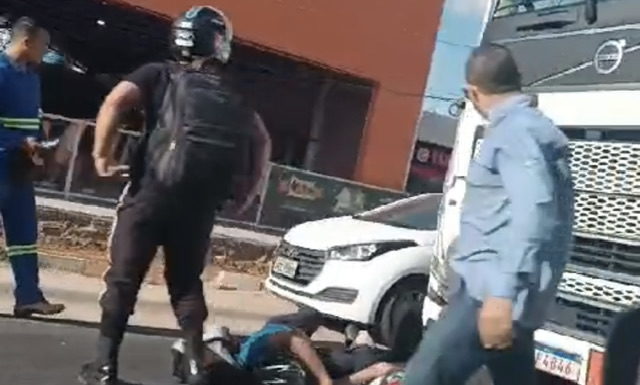 Segundo informações houve uma colisão entre uma carreta e uma moto. Duas pessoas que estavam na moto ficaram caídas ao chão. Não há informações sobre o estado de saúde das vítimas.