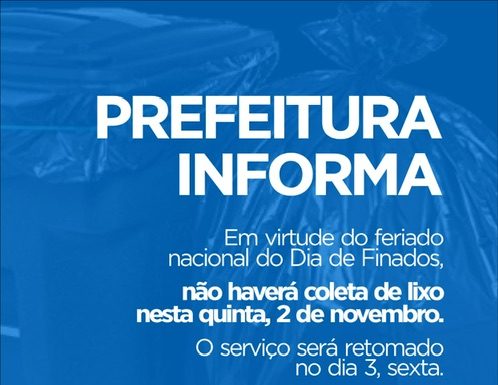 O Governo do Município de Cabrobó, por meio da Secretaria de Infraestrutura, informa à população cabroboense que nesta quinta-feira (02), em virtude do feriado de Dia de Finados, não haverá a coleta diária de lixo domiciliar nos bairros da cidade.