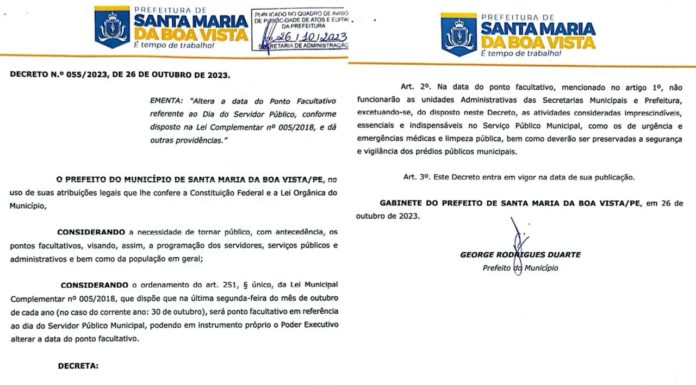 Em decreto publicado pela Prefeitura de Santa Maria da Boa Vista, foi estabelecido ponto facultativo nos órgãos públicos municipais nesta sexta-feira (03), em alusão ao feriado municipal do Servidor Público. A data seria celebrada na última segunda-feira (30), mas houve a alteração por parte da gestão diante do feriado de Finados.