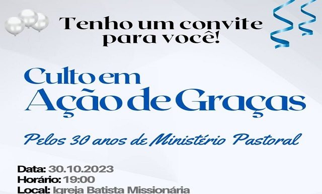 "Quero ter a honra de contar com você e sua família nesse dia de gratidão a Deus pelos meus 30 anos de ministério pastoral." - diz o Pr. Miguel.