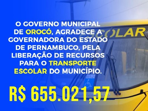 O Governo Municipal de Orocó, extensivo ao Prefeito George Gueber, parabeniza a ação e ao mesmo tempo agradece a Governadora do Estado de Pernambuco, Raquel Lyra pela liberação de recursos para o Transporte Escolar do município de Orocó.