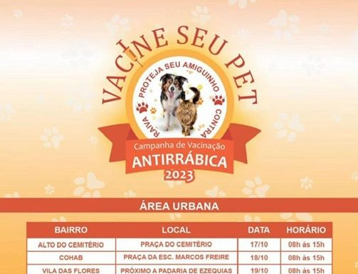 O governo de Cabrobó através da Secretaria de Saúde esta iniciando a vacinação antirrábica animal na zona urbana e na zona rural do nosso município e convida a população para vacinar o seu animalzinho.