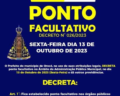 Ponto Facultativo: A Prefeitura Municipal de Orocó, decretou ponto facultativo na sexta-feira (13), após o feriado nacional de Nossa Senhora Aparecida, Padroeira do Brasil.