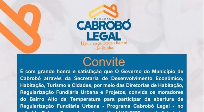 O Governo do Município de Cabrobó, por meio da Secretaria de Desenvolvimento Econômico, Habitação, Turismo e Cidades, convida os moradores do Alto da Temperatura para participarem do lançamento do Programa de Regularização Fundiária - Cabrobó Legal.